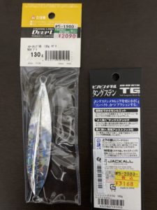 それ以外にもテンヤも見たりしていたら、その近くにタイ用のジグを発見。ジャッカルの「ビンビンメタルTG」小さくても重さのあるタングステン、こちらはグロー系ではないが絵柄が面白くて綺麗。これも買いだぁ!ってことでジグ2点を購入してしまった。合計5,258円也。