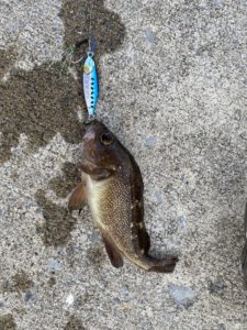 その後も足元を中心に探ると、魚がチェイスするのが見える。そのうちググッと重みが伝わり上げてみると、名前はわからんメバルみたいな魚がヒット!