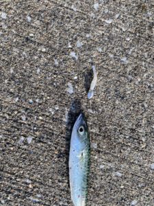 駐車場のすぐ近くの足元に小さなメタルジグを落とし込むと、早速何かが掛かった!