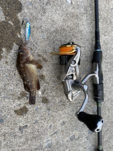 その後も足元を中心に探ると、魚がチェイスするのが見える。そのうちググッと重みが伝わり上げてみると、名前はわからんメバルみたいな魚がヒット!