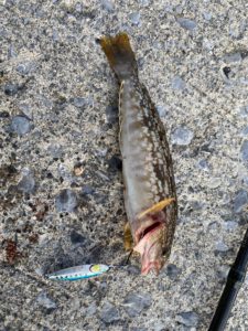 駐車場のすぐ近くの足元に小さなメタルジグを落とし込むと、早速何かが掛かった!