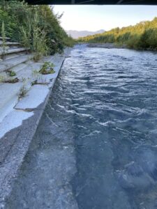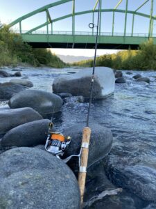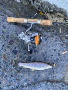次のポイント、このコンクリートの段差と石底の境目をスピナーで上流から下流に向けてリーリングしてくると、ガツンとスピナーを咥えてくれた。綺麗なアメマス。すげ〜嬉しい!ヒットルアーはゴールドブレードのスピナー。