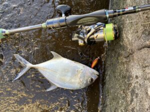 この日はバラクーダよりもメッキの照準を合わせて釣りを始めた。風も少しあった為、軽量のジグで攻めることにした。バラクーダは岸壁付近をミノーで攻めることが多いが、ジグを川の中心付近に投げてどうなるかを試してみたのだ。この釣り方が良かった。メッキはジグへの反応の方がすこぶる良かった。ジグを何度がしゃくるとググッっと竿を引き込む。バラクーダよりも引きは強い。メッキ釣りの方が面白いかもしれん。これまたすこぶる嬉しい。